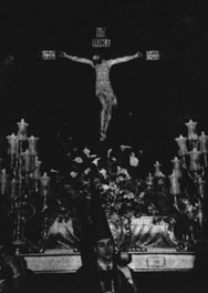 Y por fin llegó el gran día, aquel en que Jesucristo quiso morir para darnos la Vida, cuyo acto, jamás igualado en el transcurso de los siglos tanto pasados como venideros, íbamos a conmemorar. A las nueve y media de la noche, ante un inmenso gentío que se apretaba ansioso de adorar a su Dios, que loco de amor por los hombres se abrazó estrechamente al hasta entonces infame madero de la Cruz, hizo su aparición el estandarte de la Hermandad, llevado por el mayordomo señor Ruiz Riquelme, a cuyos lados se alinearon los dos tenebrarios y a continuación de los cuales una sección de penitentes alumbrantes. Un recogimiento recoleto y un silencio sólo turbado por el susurro de las oraciones y por el lejano eco de la marchas pasionarias, anunciaba la presencia del Santísimo Cristo de la Misericordia que, sobre un trono bella y severamente adornado de flor natural, iba repartiendo misericordias abundantísimas.