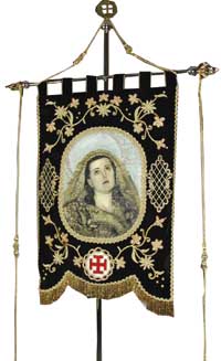 Su vestimenta, al igual que la del resto de penitentes y mayordomos consiste en la túnica negra con caperuz magenta. Igualmente desfilan en dos columnas portando un cirio