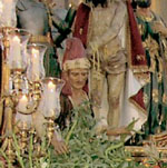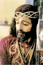 Cualquier tema de esta hermosa procesión es digno de comentario, pero yo he reparado en el paso Ecce Homo por su profundidad y realismo con la vida y sociedad que nos rodea. Este hecho narrado por San Juan en su Evangelio se lleva a los retablos de las iglesias a partir del renacimiento y se muestra como escena narrativa de los hechos. Cristo, aparece con los símbolos de la realeza que los soldados le pusieron en tono de burla, la corona de espinas y el manto púrpura, en ocasiones lleva un cetro simulado por una caña, su cuerpo muestra los signos de la flagelación, las manos atadas con una cuerda y tiene una soga alrededor del cuello que cuelga por su cuerpo hasta los pies.