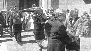 El Cristo de la Misericordia, que se encuentra durante todo el año en la Iglesia de San Miguel, es bajado de su lugar habitual y con motivo del traslado se lleva a cabo una misa solemne a las 12h. En este acto contamos con la presencia del Orfeón Fernández Caballero, que con su labor realza la emotividad del acto. A continuación acompañado por un breve cortejo, es trasladado el Cristo de la Misericordia por las mujeres de esta cofradía hasta San Esteban, donde se completa el acto con el canto del himno al Cristo. Después de este acto solemne se procede a situar el Cristo en su trono para el desfile.